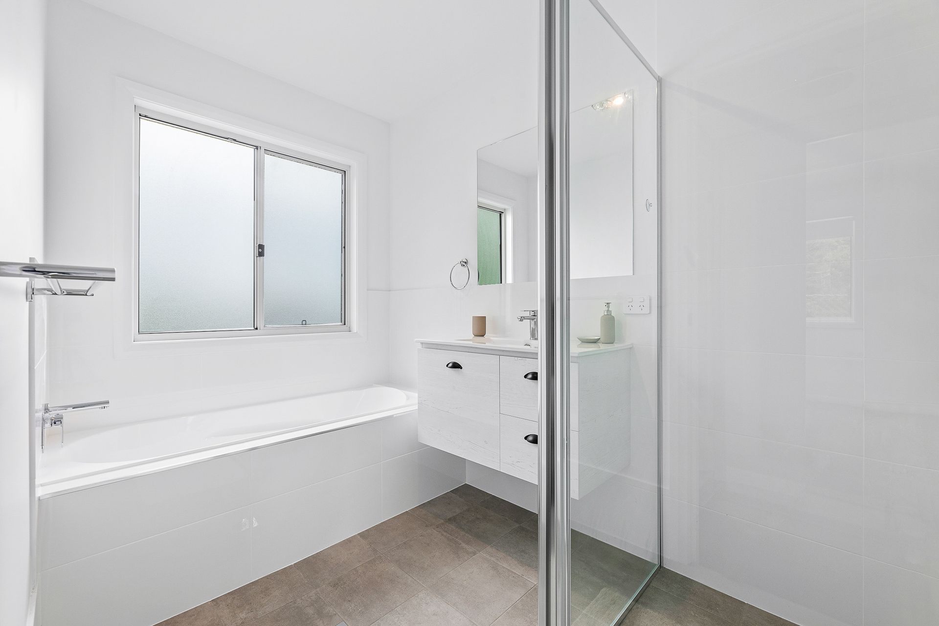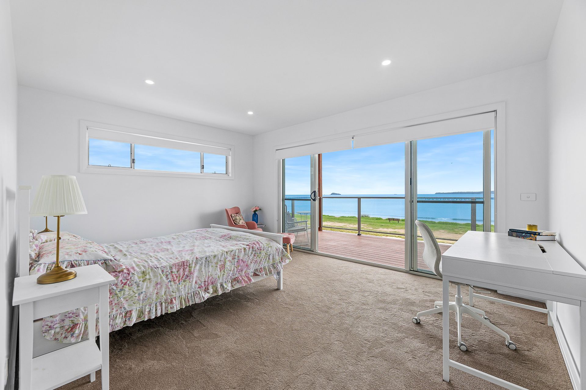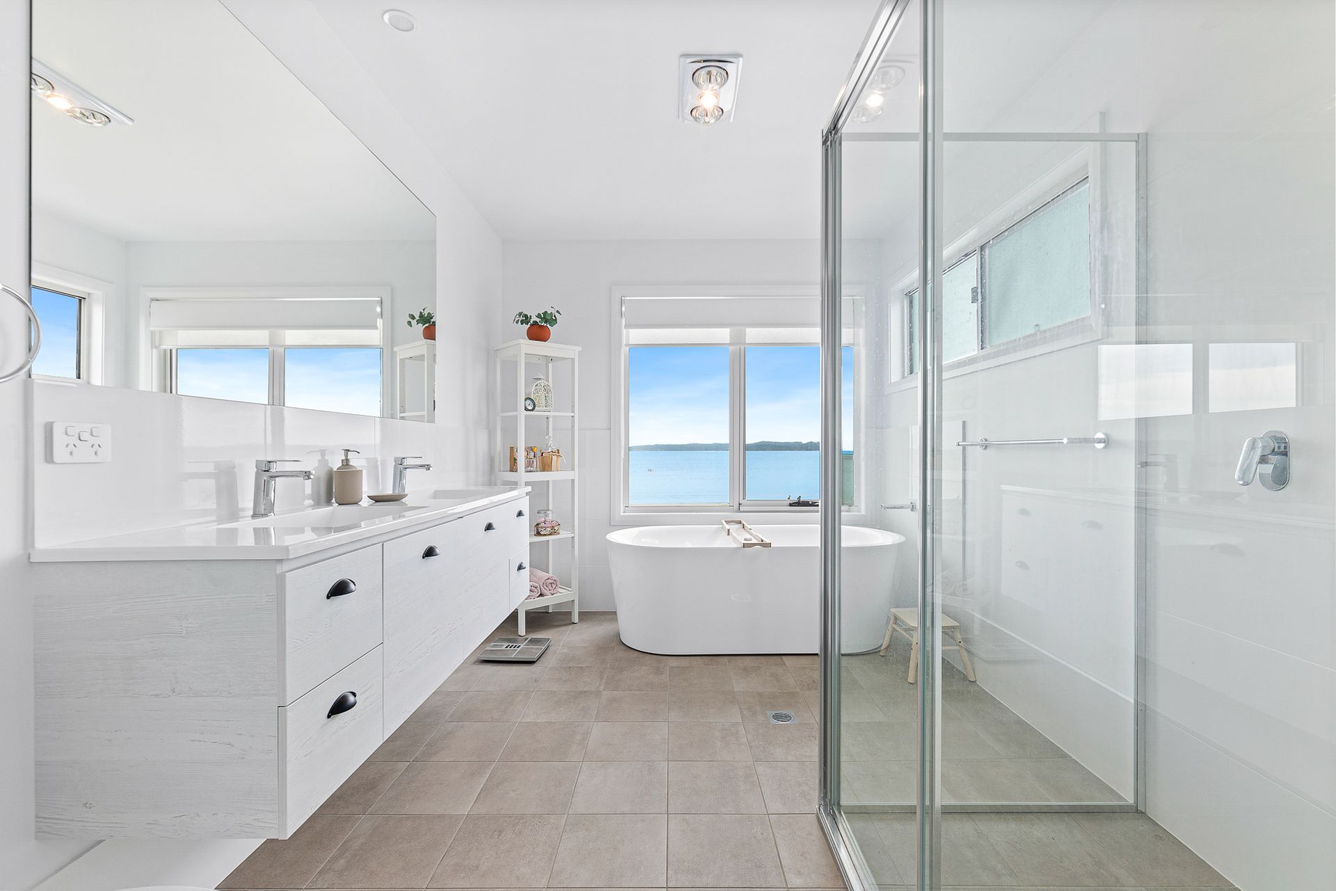 The ensuite, offers a luxurious bathtub overlooking the endless expanse of the ocean, providing both a truly unique and calming experience. Picture yourself unwinding in a tranquil bath while enjoying the breathtaking sunset over Long Beach.