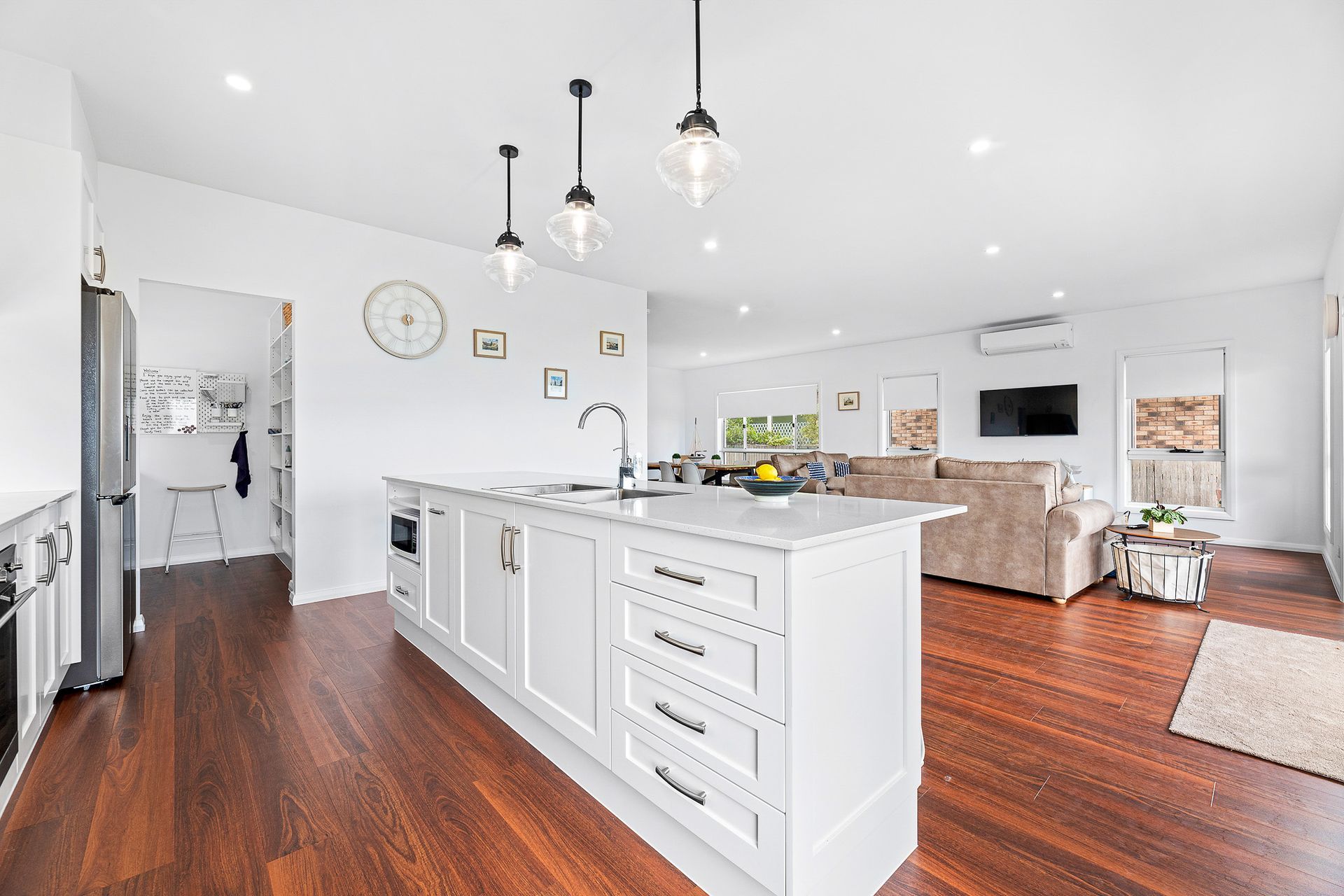 As you enter the home, you are greeted by a spacious living area that seamlessly connects to a gourmet kitchen featuring a butler's pantry, ensuring both functionality and style.