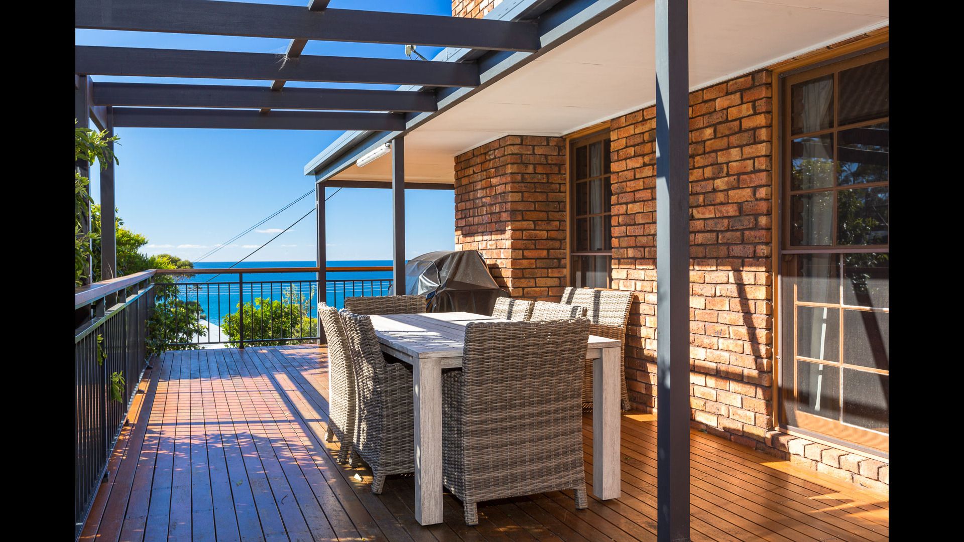 Step out onto the spacious deck, where a large family BBQ beckons, perfect for al fresco dining and entertaining against the backdrop of the ocean vista.