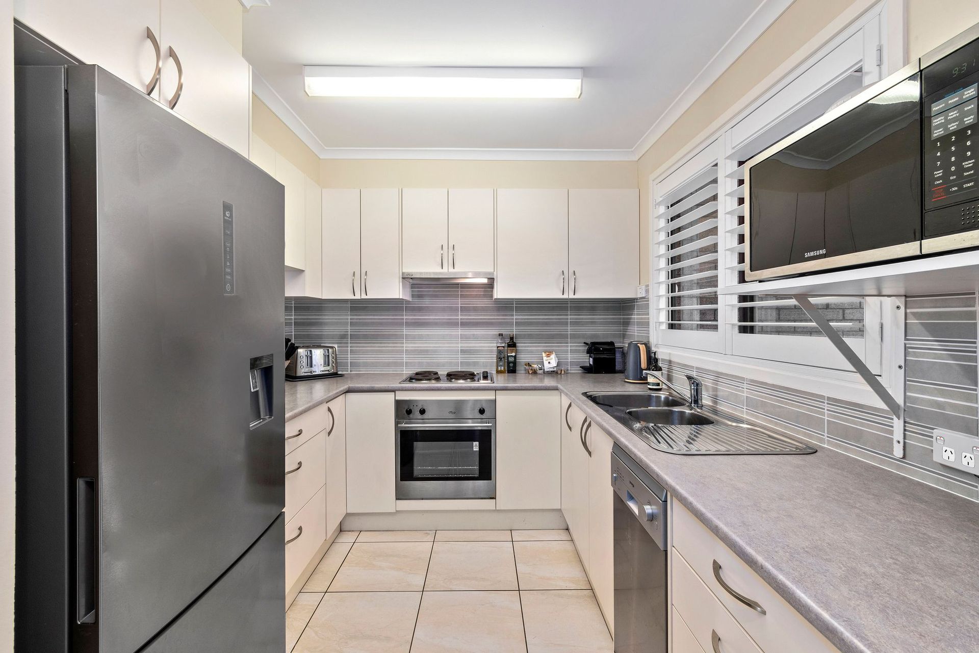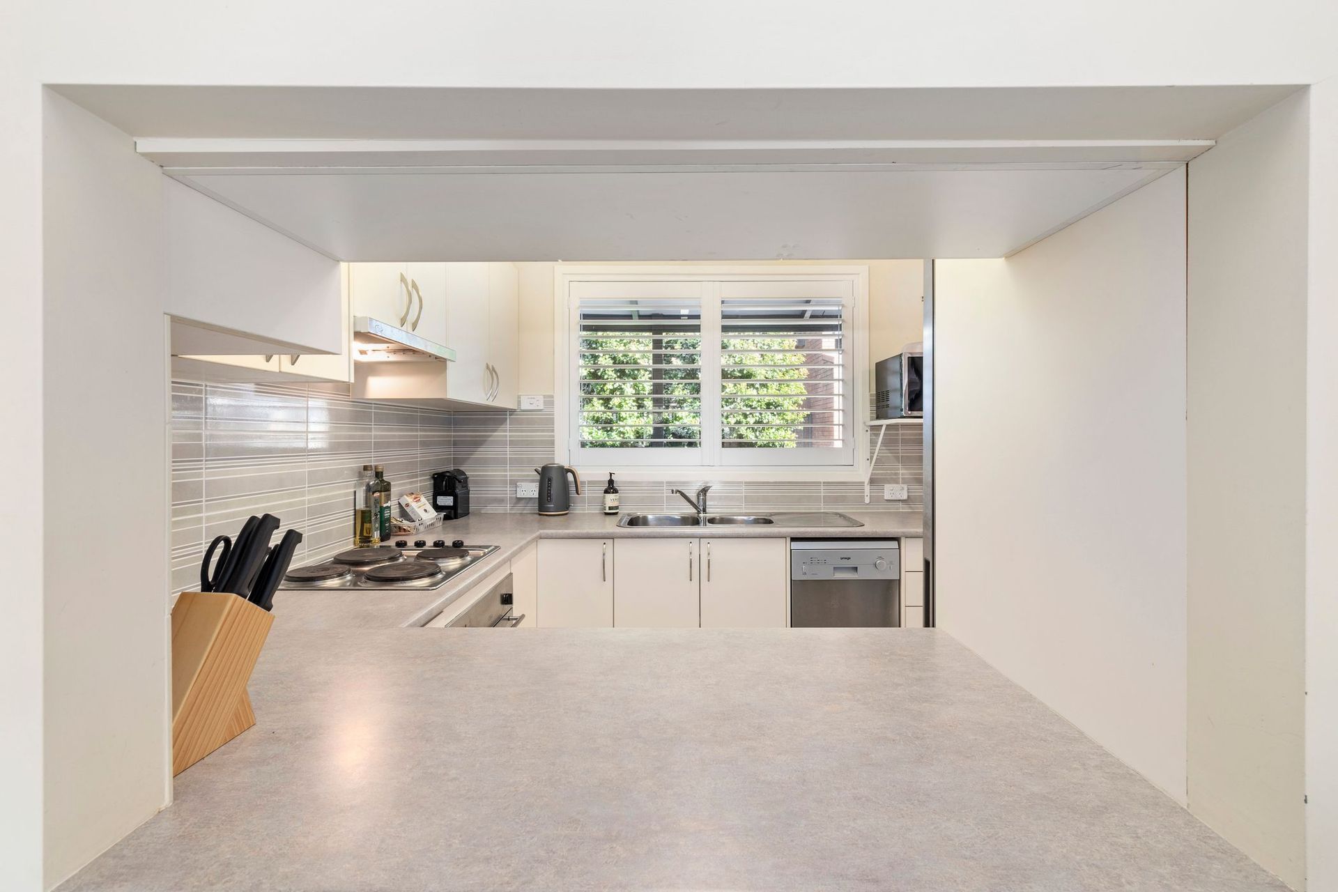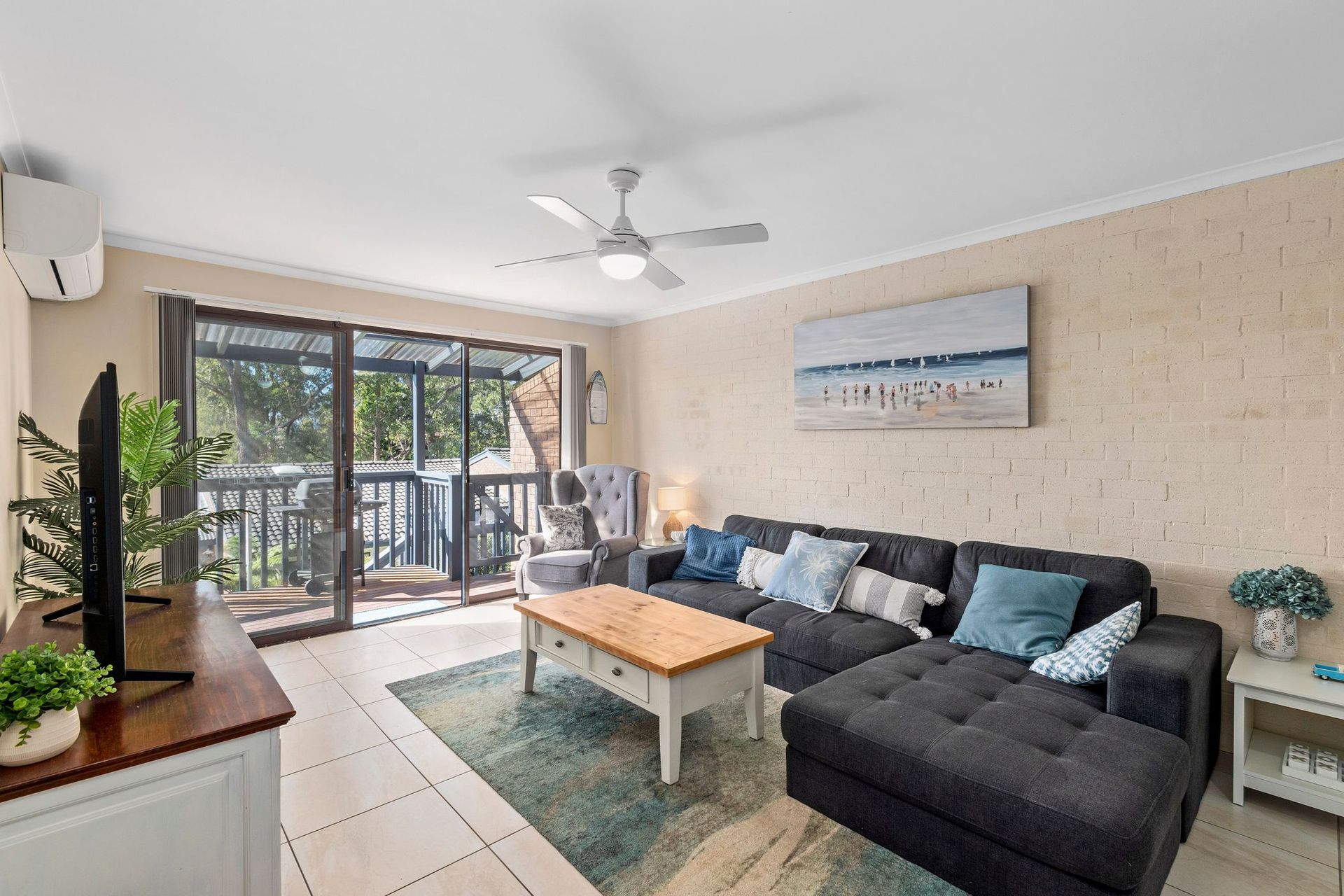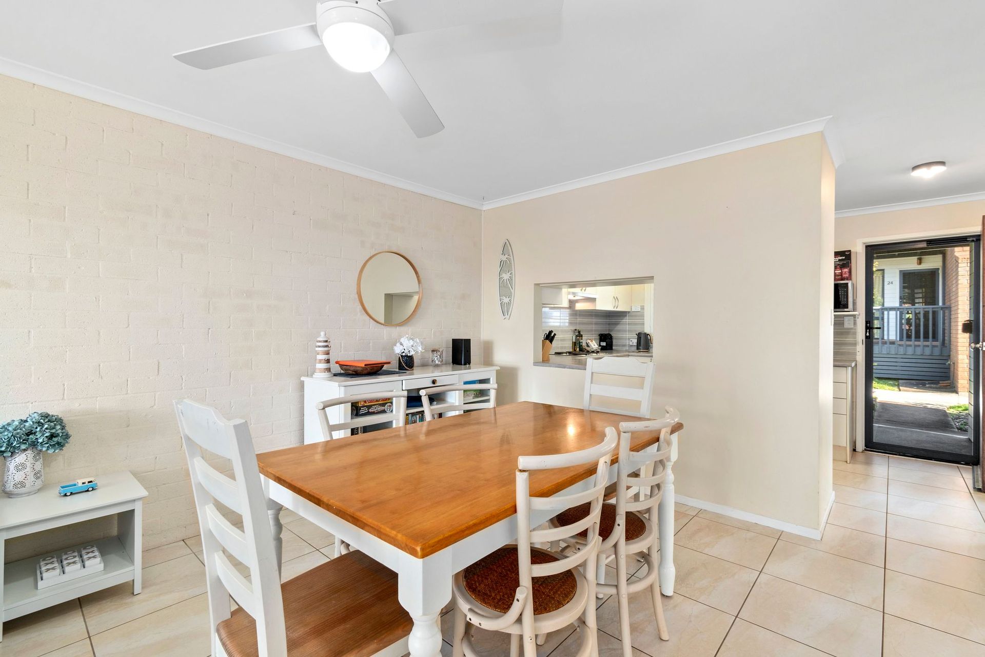 Inside, you’ll find two bedrooms with built-in wardrobes and an open-plan lounge and dining area overlooking the beach, ideal for enjoying meals or simply soaking up the coastal atmosphere. The spacious kitchen comes complete with a dishwasher, making cooking easy and stress-free.